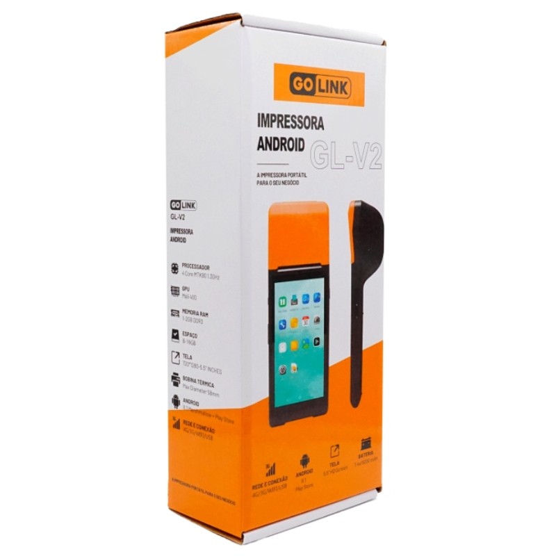 Uma impressora da Golink que oferece 8GB de RAM, junto de tela touch de 5.5 polegadas e projetada para realizar impressões de notas e cupons de até 58MM, com sistema android 8.0 instalado e acesso a playstore e conexão Bluetooth.
